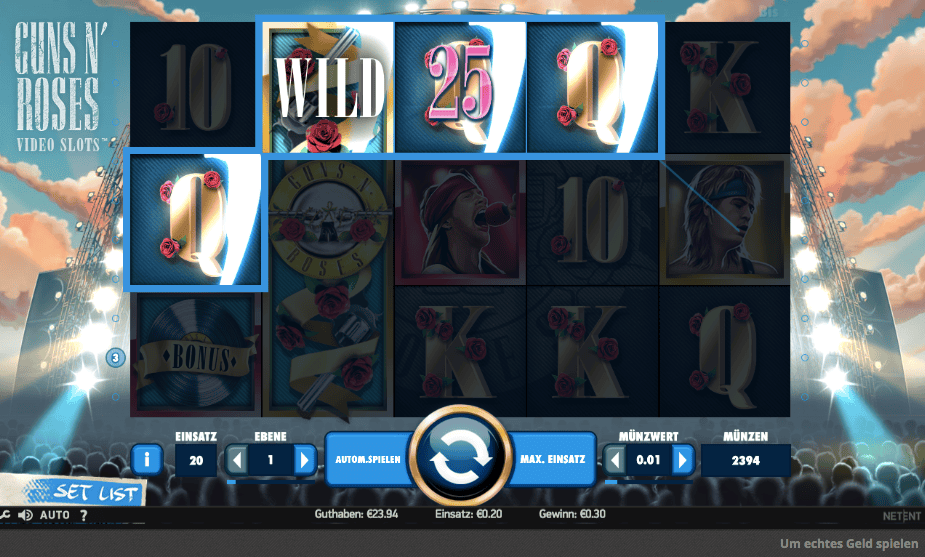 Den Slot Guns N‘ Roses gibt es ausschließlich in Online-Casinos, die NetEnt- Spielautomaten anbieten. Nur dort ist es möglich, ihn kostenlos zu spielen – und zwar ohne Risiko, denn mit Spielgeld kann man ihn beliebig lang testen. Um diesen Demo-Modus zu nutzen, ist maximal eine Registrierung nötig und auch die ist kostenlos.