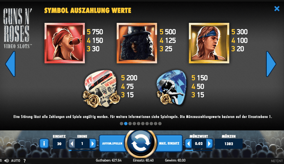 Seit 25 Jahren hoffen die Fans von Guns N‘ Roses auf ein neues Album in der legendären Besetzung mit Axl Rose, Slash und Duff McKagan. 2016 kam es zur Wiedervereinigung – aber bis ein neues Album veröffentlicht wird, könnte es noch eine Weile dauern. Die Wartezeit verkürzen die Online-Casino-Hitproduzenten von NetEnt mit ihrem Guns N‘ Roses Slot, einem Teil der populären „NetEnt Rocks“-Trilogie. Selbstverständlich haben sich die schwedischen Spielemacher für diesen Slot die Original-Lizenz von Guns N‘ Roses gesichert.