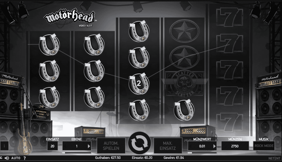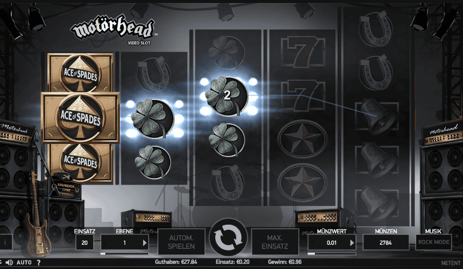 Für den Motörhead-Slot haben sich NetEnt an ihrem Retro-Hit „Dazzle Me“ bedient: Die fünf Walzen haben drei, drei, vier, vier und fünf Reihen – und darauf befinden sich sage und schreibe 76 Gewinnlinien! Welche davon aktiviert sind, kann man nicht selbst bestimmen – es werden immer alle 76 gespielt. Das vergrößert die Gewinnchancen erheblich. Der Einsatz beträgt zwischen einem Cent und einem Euro – das macht pro Dreh zwischen 20 Cent und 200 Euro. Wie viel man einsetzt, hängt von dem Bet-Level ab, welches zwischen eins und 10 wählbar ist.