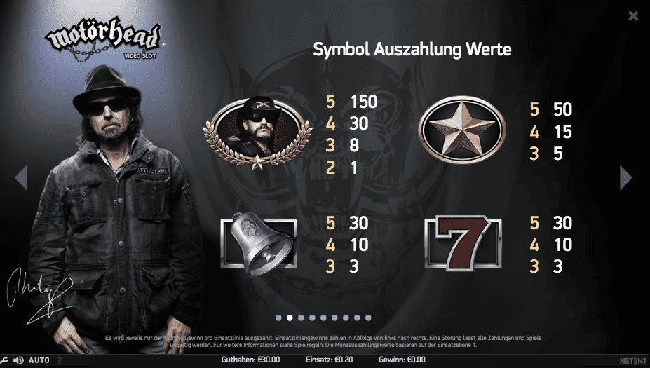 Genauere Informationen über die Werte der einzelnen Symbole sowie die Erklärungen zu den beiden Features, eine Übersicht der Gewinnlinien und sonstige Details findet man in der Auszahlungstabelle. Diese ist beim Motörhead-Slot etwas versteckt: Sie ist links unten am Spielfeldrand nur über ein winziges „i“ abrufbar.