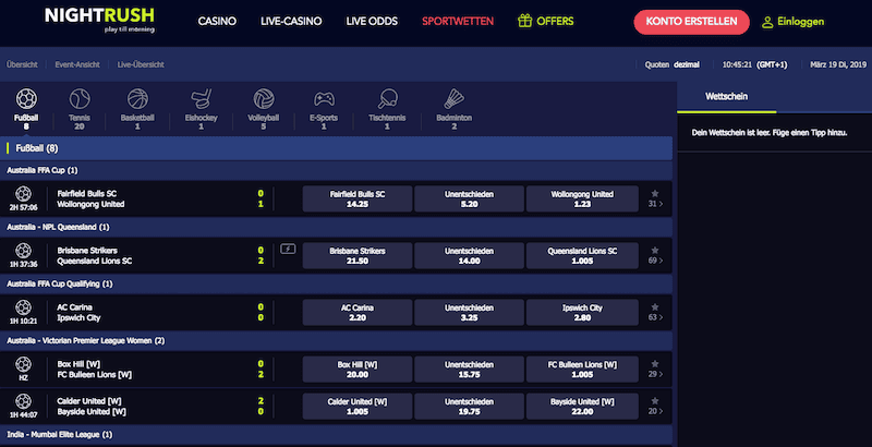 Das Nightrush Casino bietet nicht nur zahlreiche Casino-Spiele im Angebot, sondern auch einen großen Sportwetten-Bereich. In diesem findet man nicht nur die klassischen Fußballigen aus England, Spanien, Italien, Frankreich oder Deutschland, sondern auch US-Sport wie American Football, Basketball und Eishockey und natürlich auch Tennis, Motorsport, Pferderennen und sogar E-Sports. Sportfans kommen hier also voll und ganz auf ihre Kosten. Das natürlich auch über Live-Wetten.