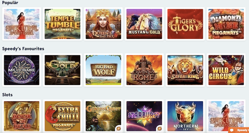 Obwohl das Speedy Casino erst seit Mitte 2018 den Markt der Online-Casinos bereichert, kann es bereits eine hohe Zahl an Spielen aufbieten. Insbesondere die Spielautomaten oder Slots haben es den Schweden angetan, so können Spieler hier an über 700 Automaten ihr Glück versuchen. Dabei macht es die Plattform von Beginn an richtig und setzt auf ausgewählte Titel bekannter Entwickler, darunter NetEnt, Microgaming, Quickspin oder Play N’Go. Zum Portfolio gehören Slot-Klassiker wie Gonzo’s Quest, Starburst oder Book Of Dead genauso wie eine Vielzahl von Jackpot-Slots, Tisch-Spielen und ein Live-Casino, welches von Evolution Gaming zur Verfügung gestellt wird. Hier werden Spieler per Stream direkt in eine echte Spielbank versetzt, in der sie am Tisch gegen reale Dealer und Croupiers etwa Poker, Roulette, Baccarat oder Black Jack spielen. Eine Sonderrolle nehmen die sogenannten „Blitz Games“ ein. Hier laufen die Walzen auf sechsfacher Geschwindigkeit – ganz nach dem Namen des Casinos eben speedy. Der Großteil der Spiele kann dabei auch ganz ohne Einzahlung mit Spielgeld ausprobiert werden, um sich an Modus, Regelwerk und Eigenheiten der einzelnen Titel zu gewöhnen.